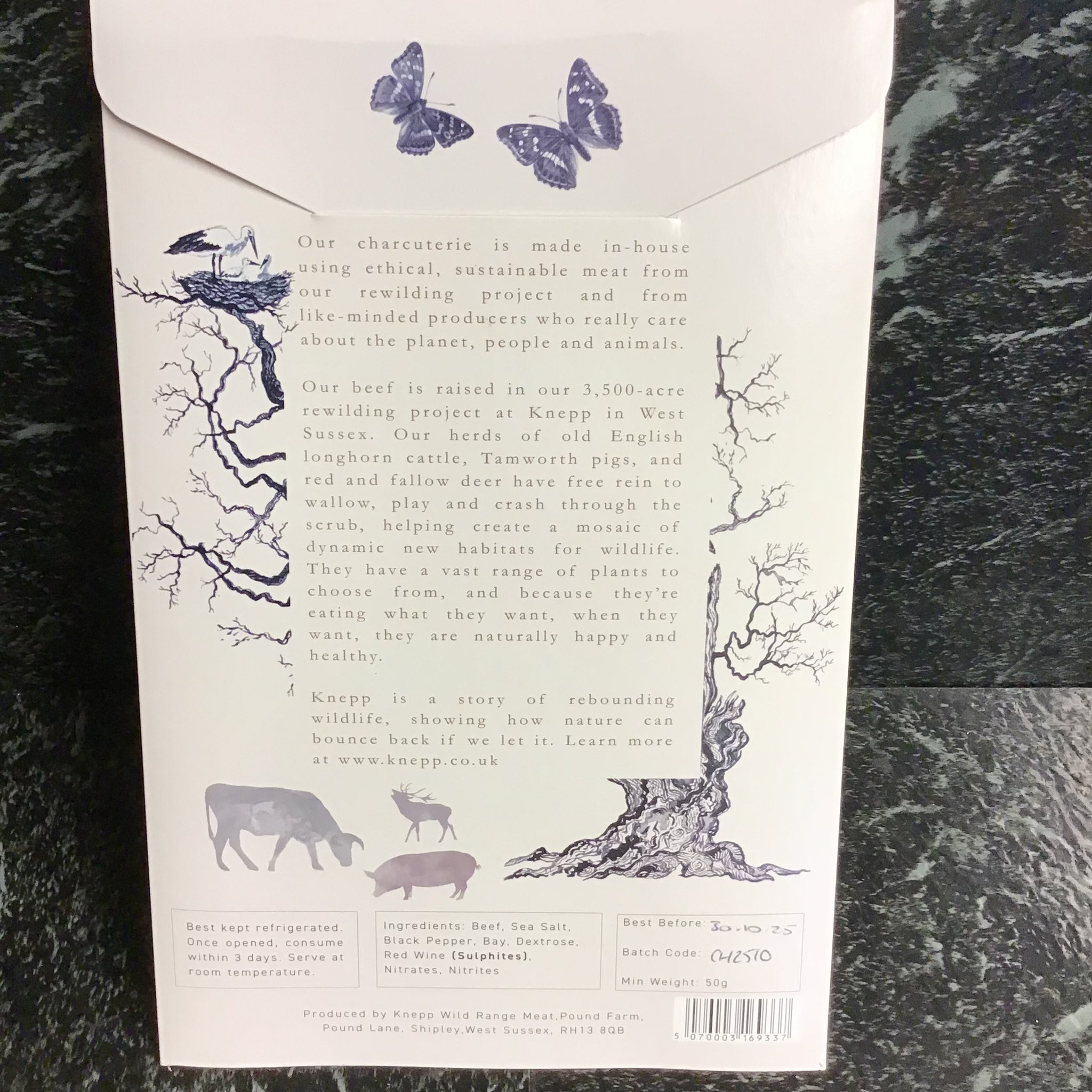 Made using organically reared beef from the Knepp Estate. The muscles are rubbed with a blend of herbs and spices with the addition of bay leaves, followed by an air drying maturation process for around 6-12 weeks until it’s ready to slice thinly.