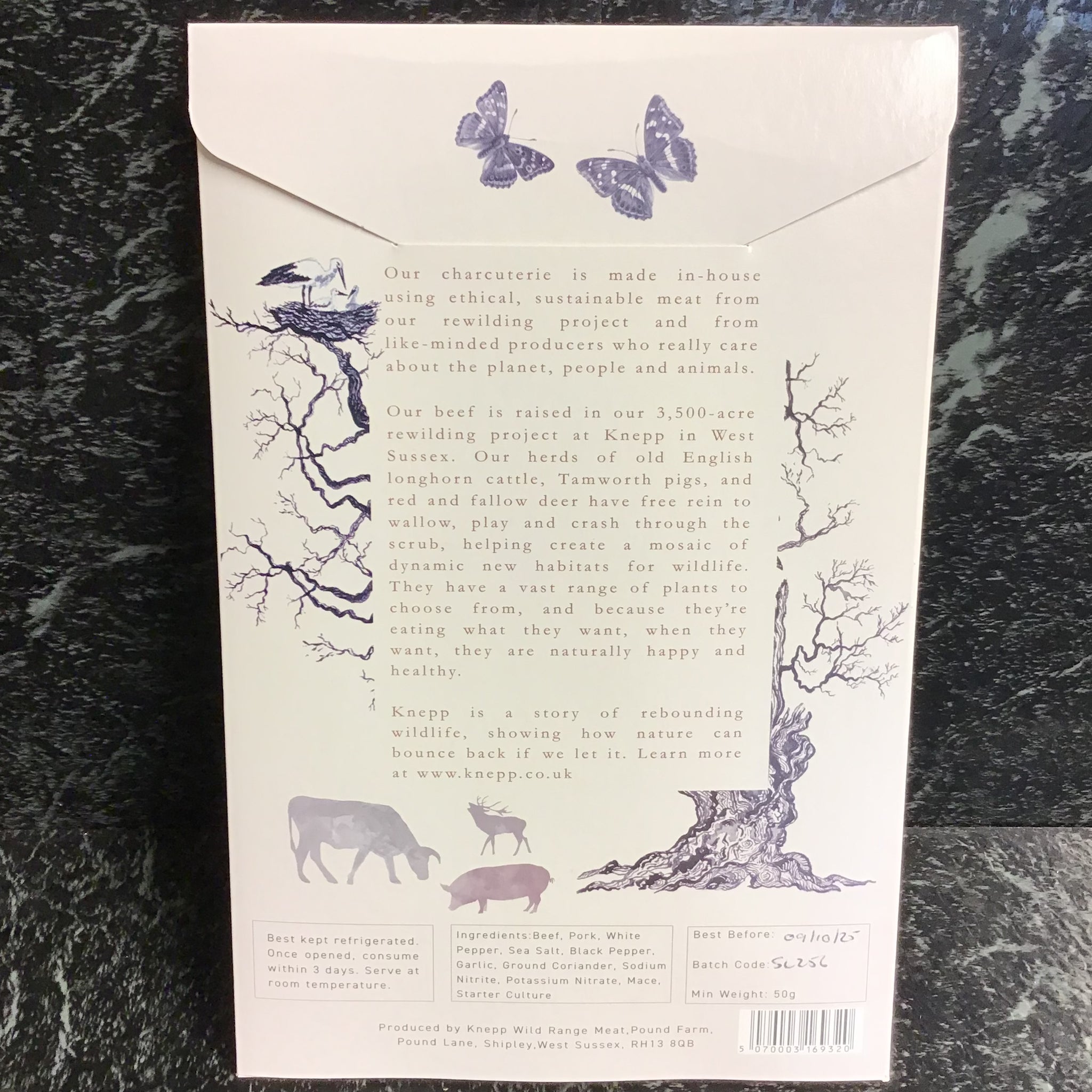 Made using organically reared beef from the Knepp Estate, along with a little bit of free range pork. This is minced with a house blend of spices to create a modern twist to a classic style salami.